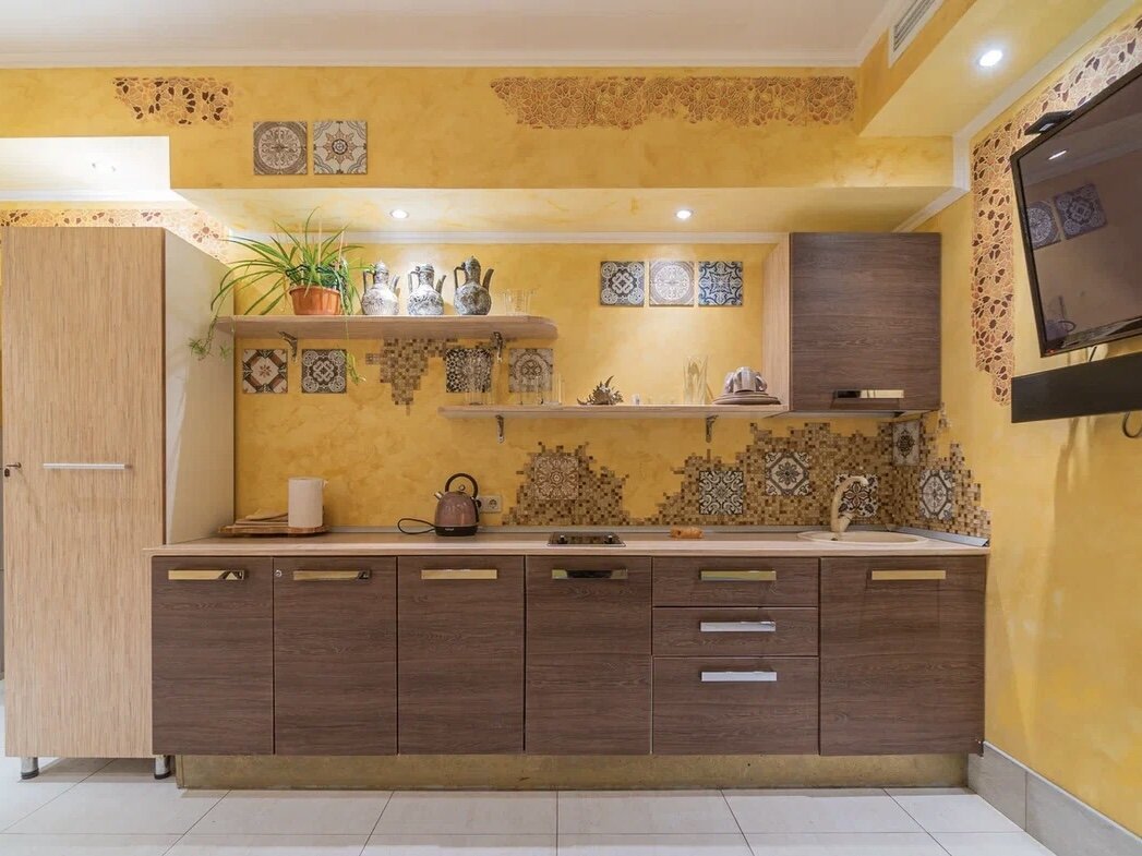 Есть оборудованная кухня , столовые приборы и посуда, чайник.